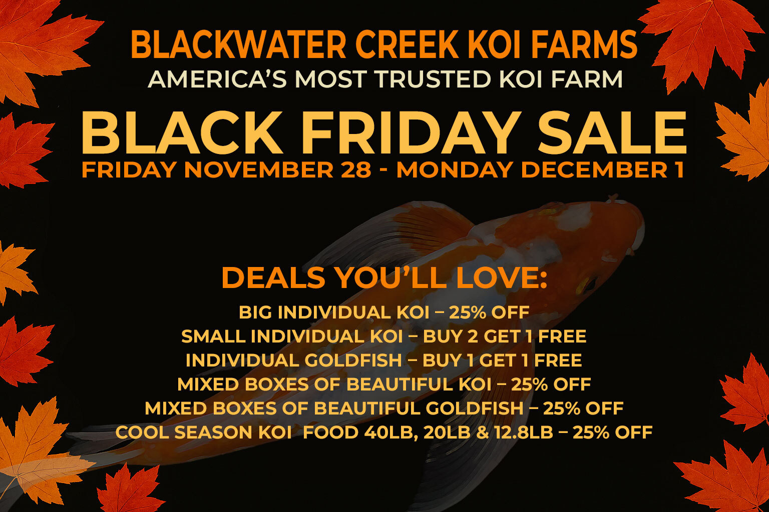 Blackwater Creek Koi Farms offers the very best Koi and Goldfish for sale online in the USA. When buying Koi produced at one of our two Bio Secure Koi farms you will receive healthy American bred and raised Koi guaranteed. Read more about our history of testing and our Bio Secure practices. We sell to both wholesale buyers and to retail shoppers.